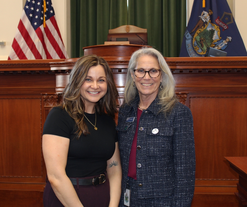 211 Maine Program Director Nikki Williams and Rep. Lori Gramlich (D-Old Orchard Beach) pose before the co-sponsored joint resolution went to the House.